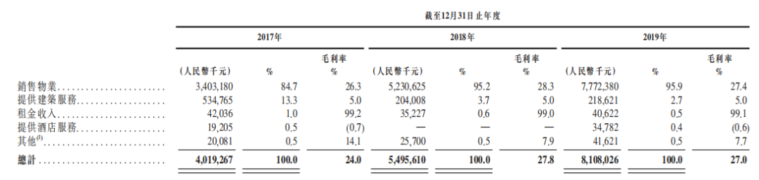 作为综合物业提供商,主营开发住宅物业外,大唐地产亦开发商业物业,包括办公楼宇、酒店、购物中心及其他。具体来看,2019年,大唐地产销售物业、提供建筑、租金收入、提供酒店服务及其他业务分别占比95.9%、2.7%、0.5%、0.4%和0.5%;毛利率分别为27.4%、5.0%、99.1%、0.6%、7.7%。