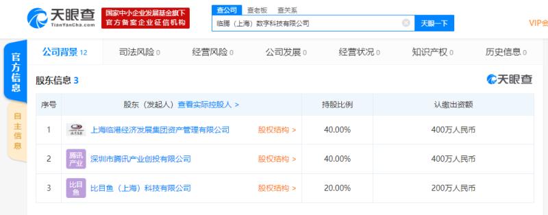 天眼查股东信息显示, 上海临港经济发展集团资产管理有限公司和深圳市腾讯产业创投有限公司分别持有该公司40%的股份,为公司最大股东;比目鱼(上海)科技有限公司持股20%,为公司第二大股东。