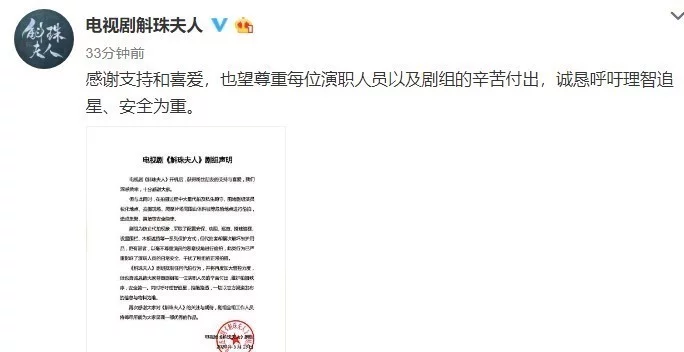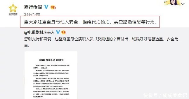 嘉行传媒也转发《斛珠夫人》剧组声明,呼吁大家注重自身与他人安全,拒绝代拍偷拍、买卖路透信息等行为。