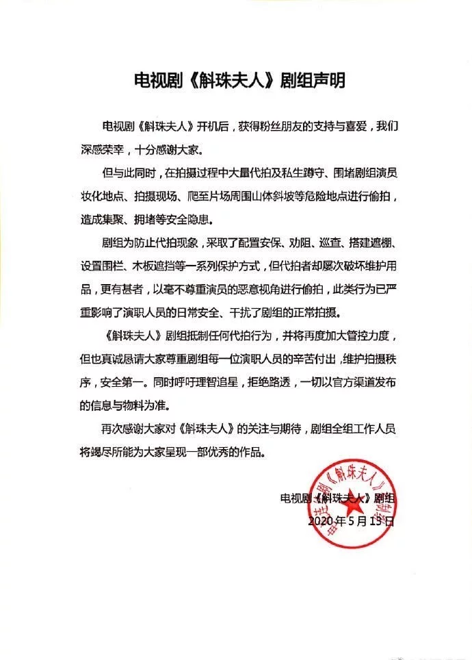 面对网络上关于杨幂遭代拍者恶意拍摄话题,5月13日下午,斛珠夫人剧组V博发声明,称剧组为防止代拍,采取了安保、劝阻、巡查等一系列保护措施,但代拍者却屡次破坏维护用品,更有甚者以毫不尊重演员的恶意方式偷拍,此类行为已严重影响演职人员日常安全,干扰了剧组正常拍摄。声明中还强调剧组抵制任何代拍行为,将加大管控,并呼吁大家理智追星。