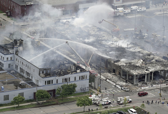 1,在明尼苏达州最大城市明尼阿波利斯,繁华街区遭到洗劫。确实是洗劫,已经不是焚烧一两所房子那么简单,而是烧成了片。如果你只看照片,你估计都猜不到这是美国,可能还以为是在中东或非洲的某个战场。