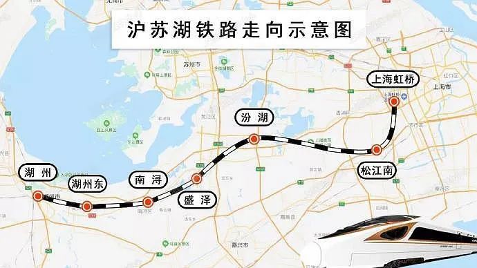 △沪苏湖铁路东起上海市,途经江苏省苏州市吴江区,沿太湖南岸西至浙江省湖州市,设计时速350公里。