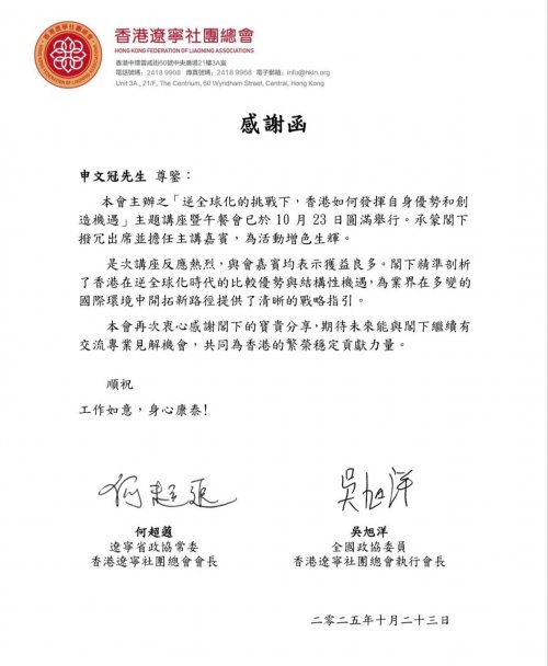 感谢函中明确提及,活动反响热烈,与会嘉宾均表示获益良多。两位委员在函中强调,申文冠先生的专业分享,为活动增色生辉,也为推动香港与内地的经贸交流、助力香港融入国家发展大局注入积极力量。