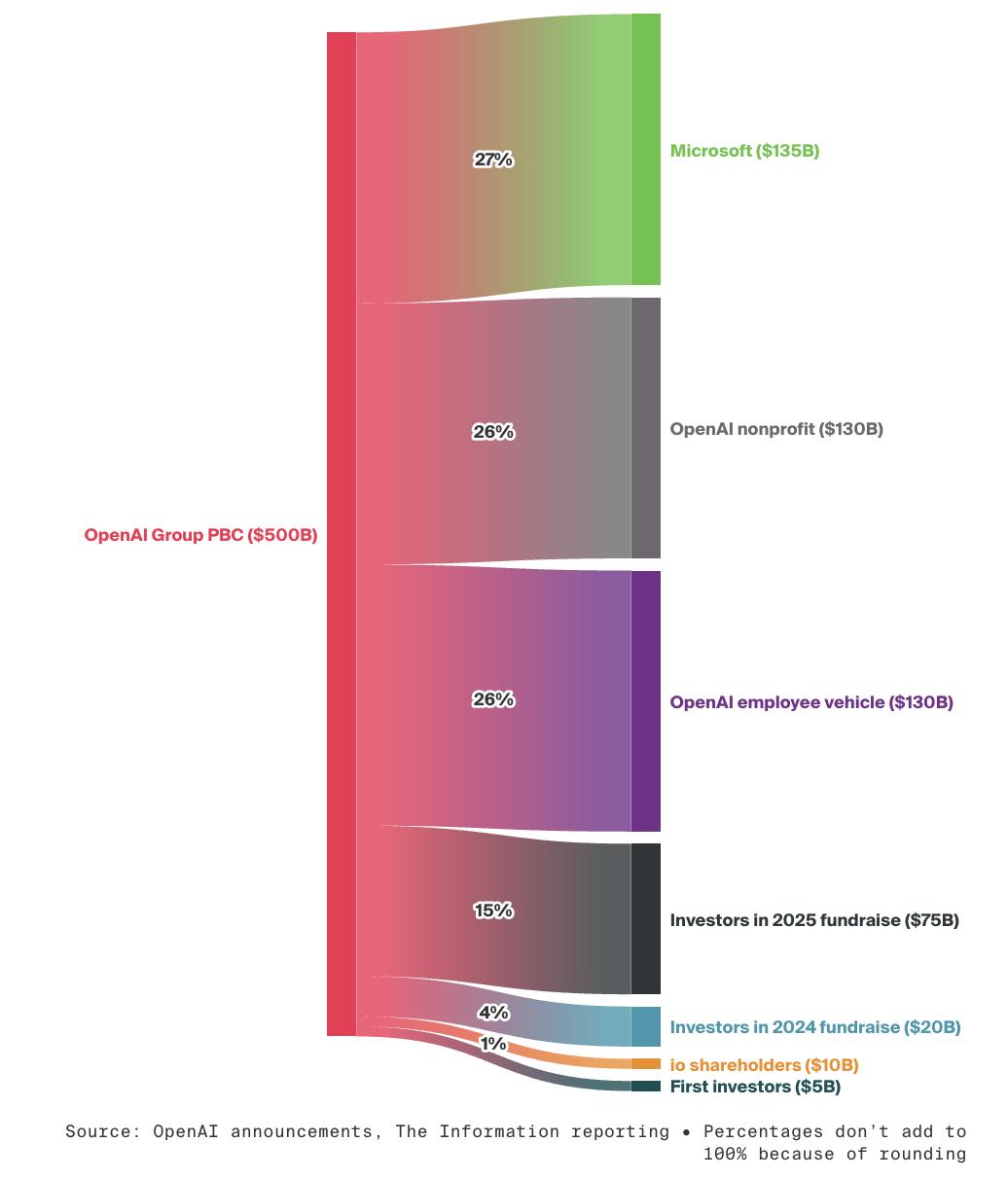 不过从10月底OpenAI公布的最新股价图来看,微软持有27%的股份价值1350亿美元(折合人民币约9584亿元),远超软银。