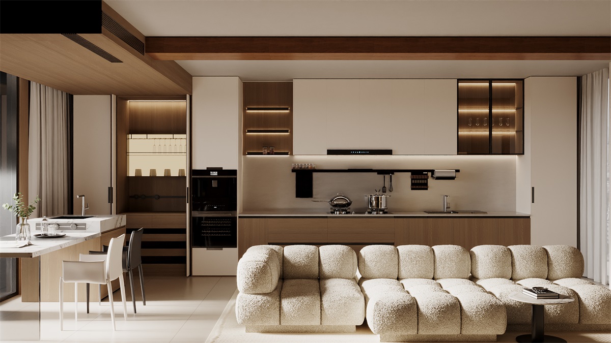 厨房手扫即动的下挂调味篮、衣柜开门自亮的感应灯带、一键启动的离家模式……精心设计的全屋定制与装配式木结构空间相得益彰,让科技自然融入生活。